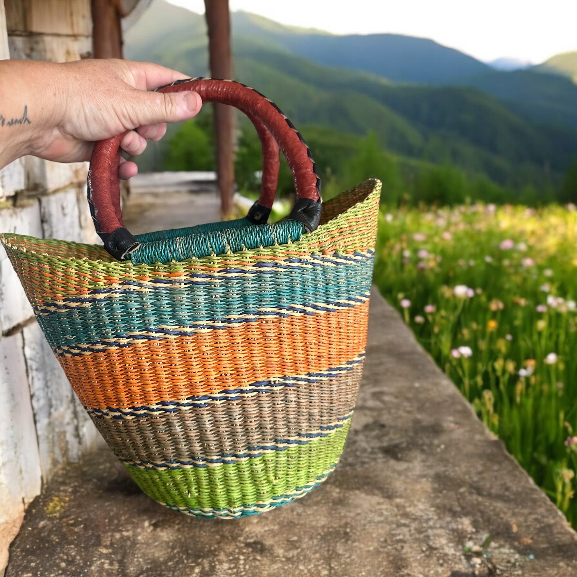 This basket is a bold statement in sustainability.Not only ethically sourced and environmentally friendly, it is a statement piece. Great smaller size for wallet,keys and phone the perfect day basket ‘Saffron Shadows’