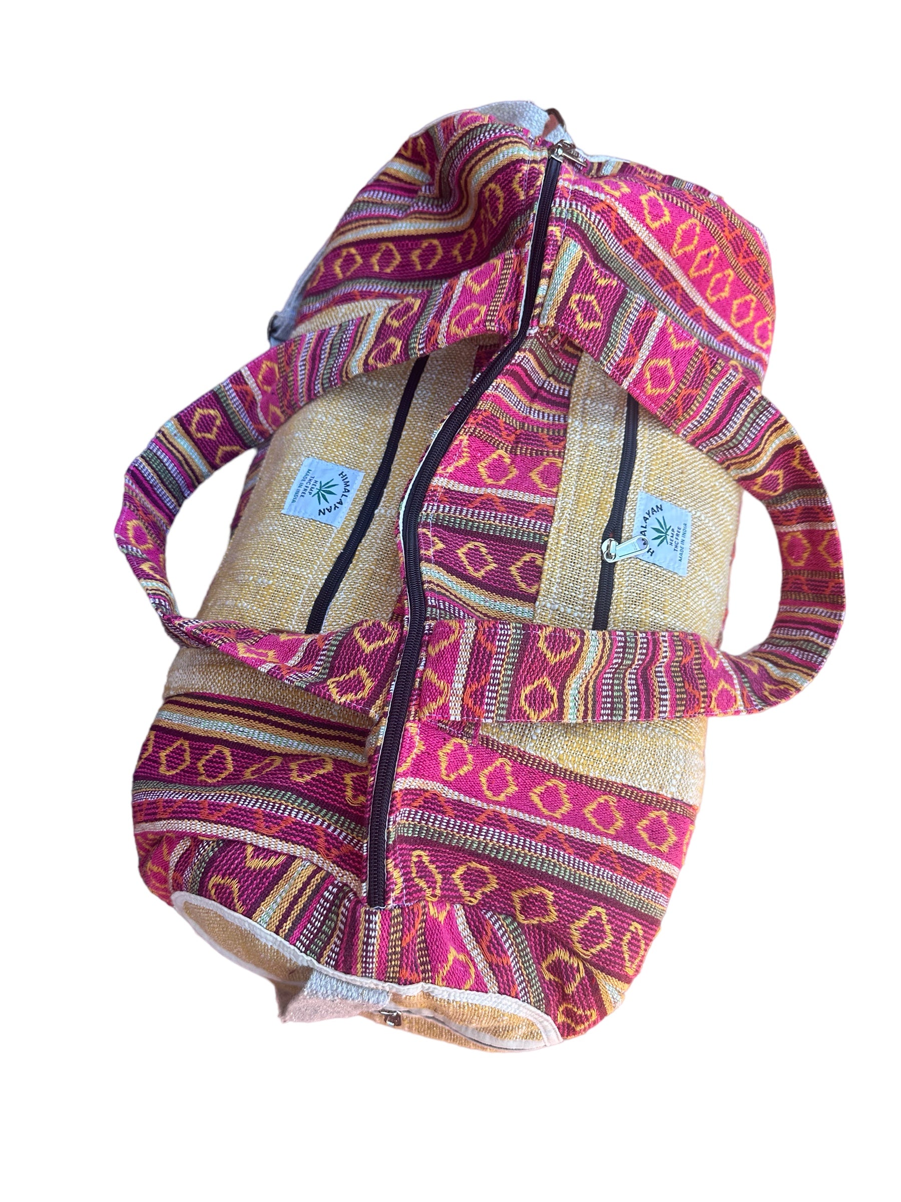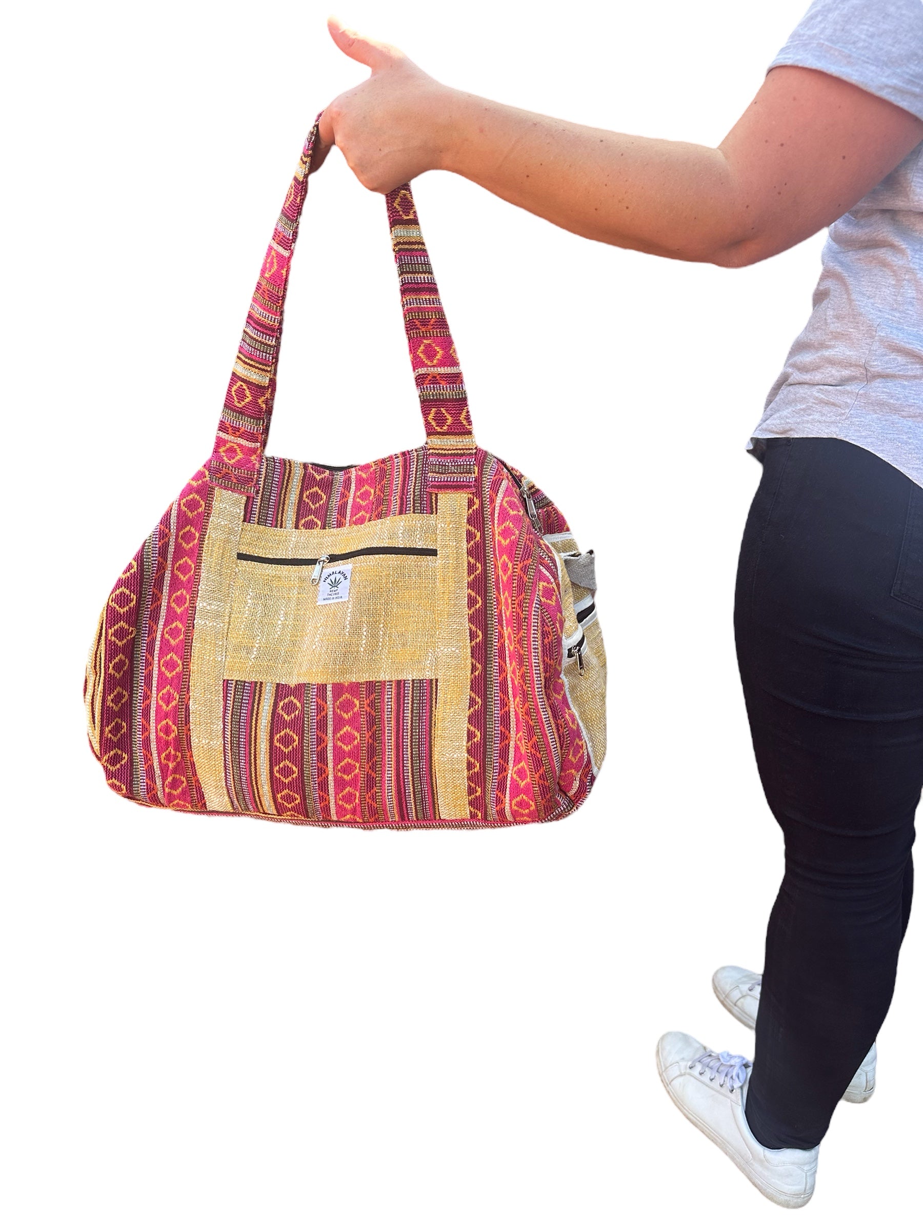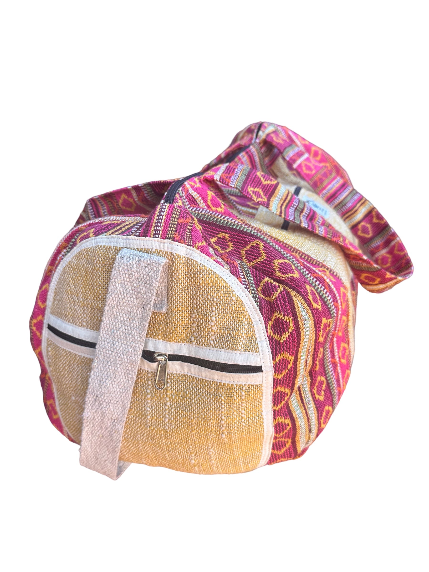 Upgrade your travel game with our Hemp Weekender Bag #34. Perfect for yoga, camping, or a weekend getaway, this highly functional bag features adjustable crossbody and shoulder straps, cotton lining for durability, and external zipper pockets for easy access. Made in Nepal with a cotton blend hemp material, it's versatile for both men and women. Order yours today and travel in style!