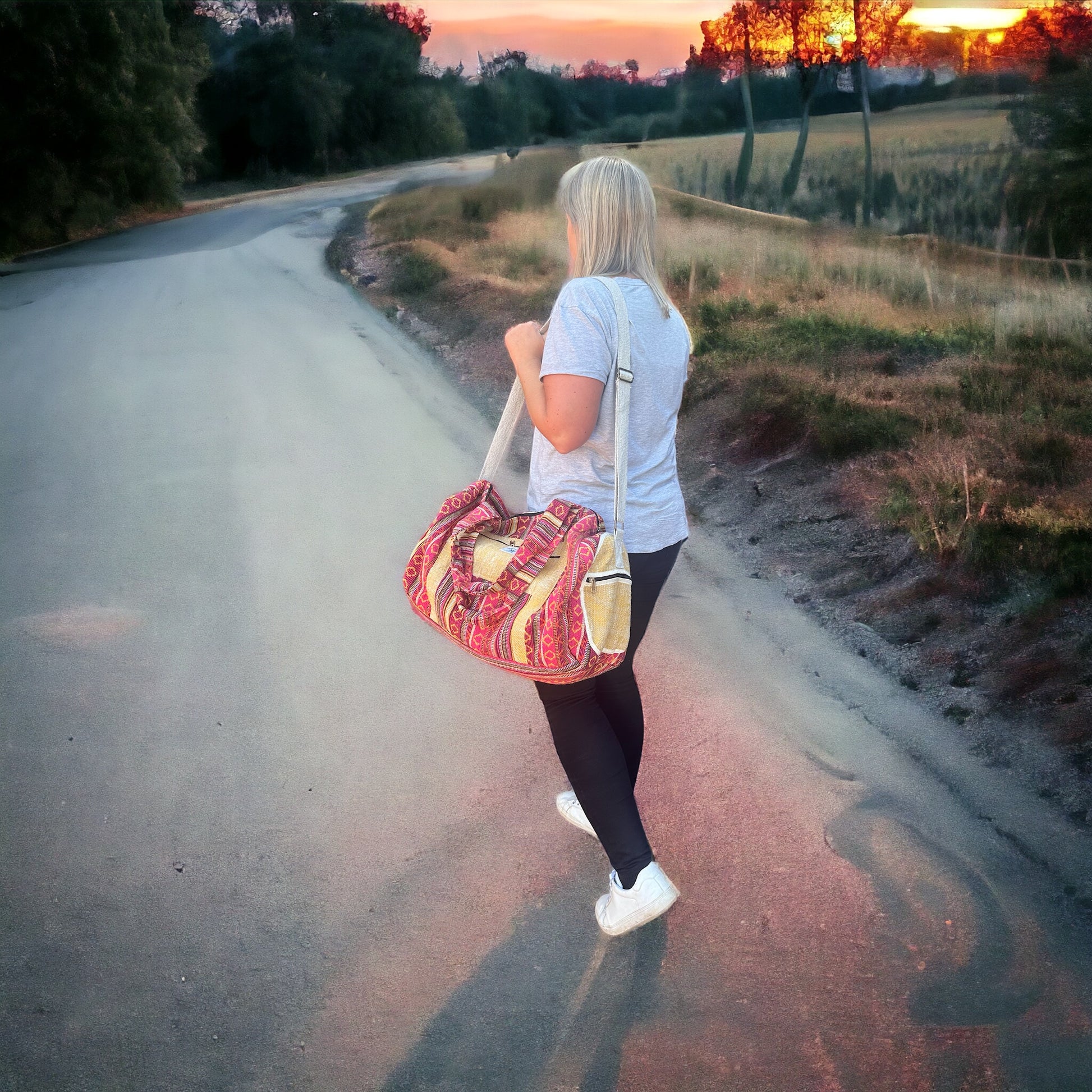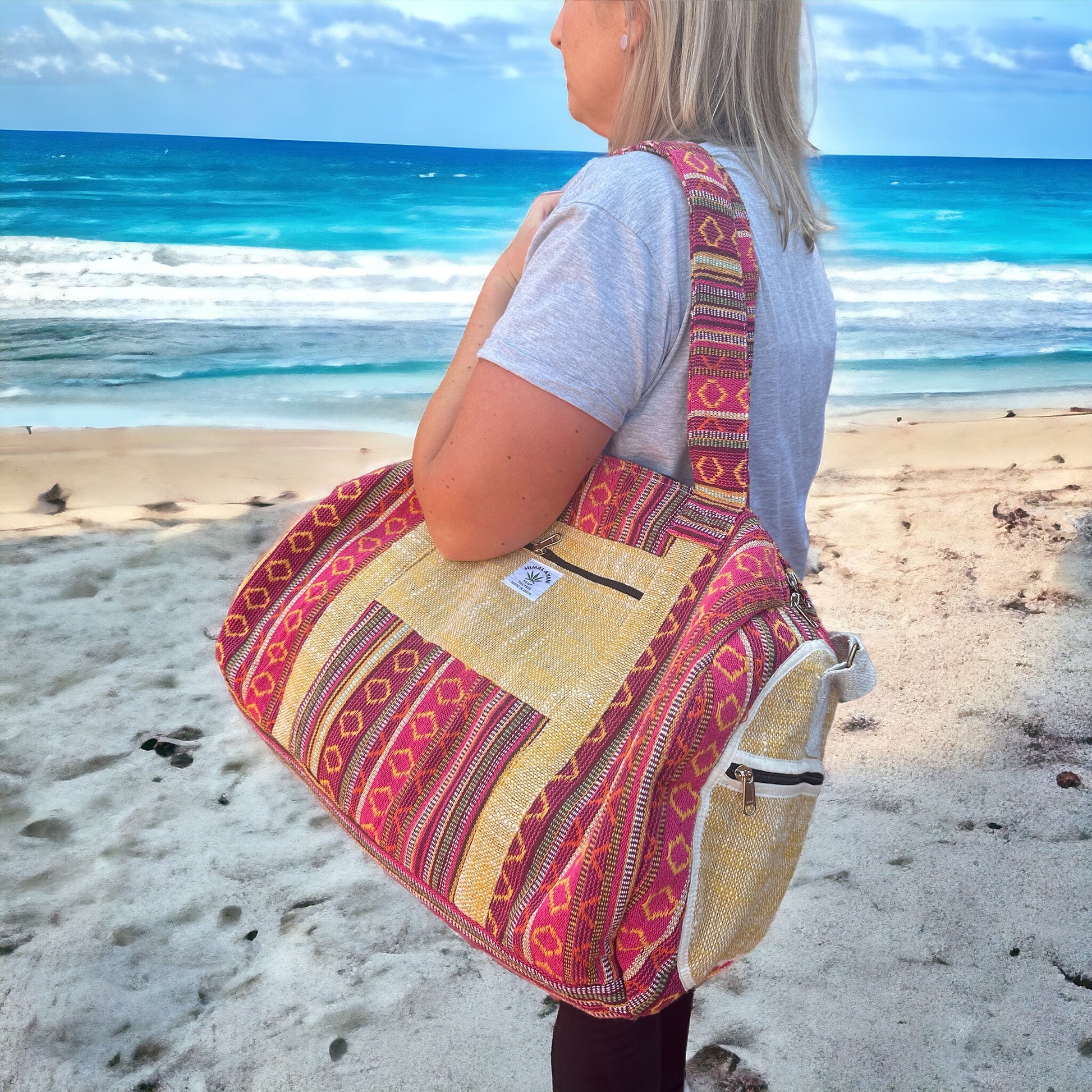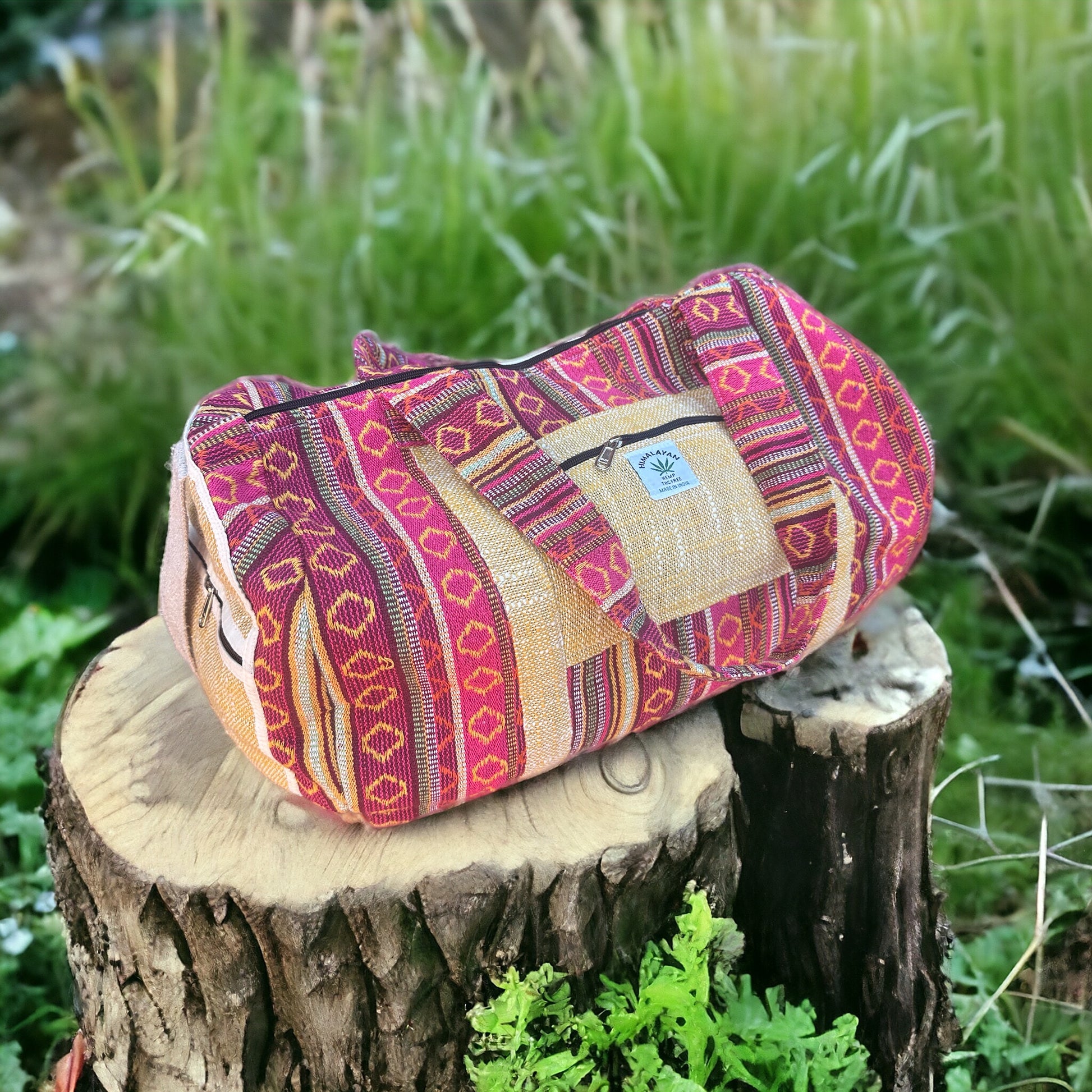 Upgrade your travel game with our Hemp Weekender Bag #34. Perfect for yoga, camping, or a weekend getaway, this highly functional bag features adjustable crossbody and shoulder straps, cotton lining for durability, and external zipper pockets for easy access. Made in Nepal with a cotton blend hemp material, it's versatile for both men and women. Order yours today and travel in style!