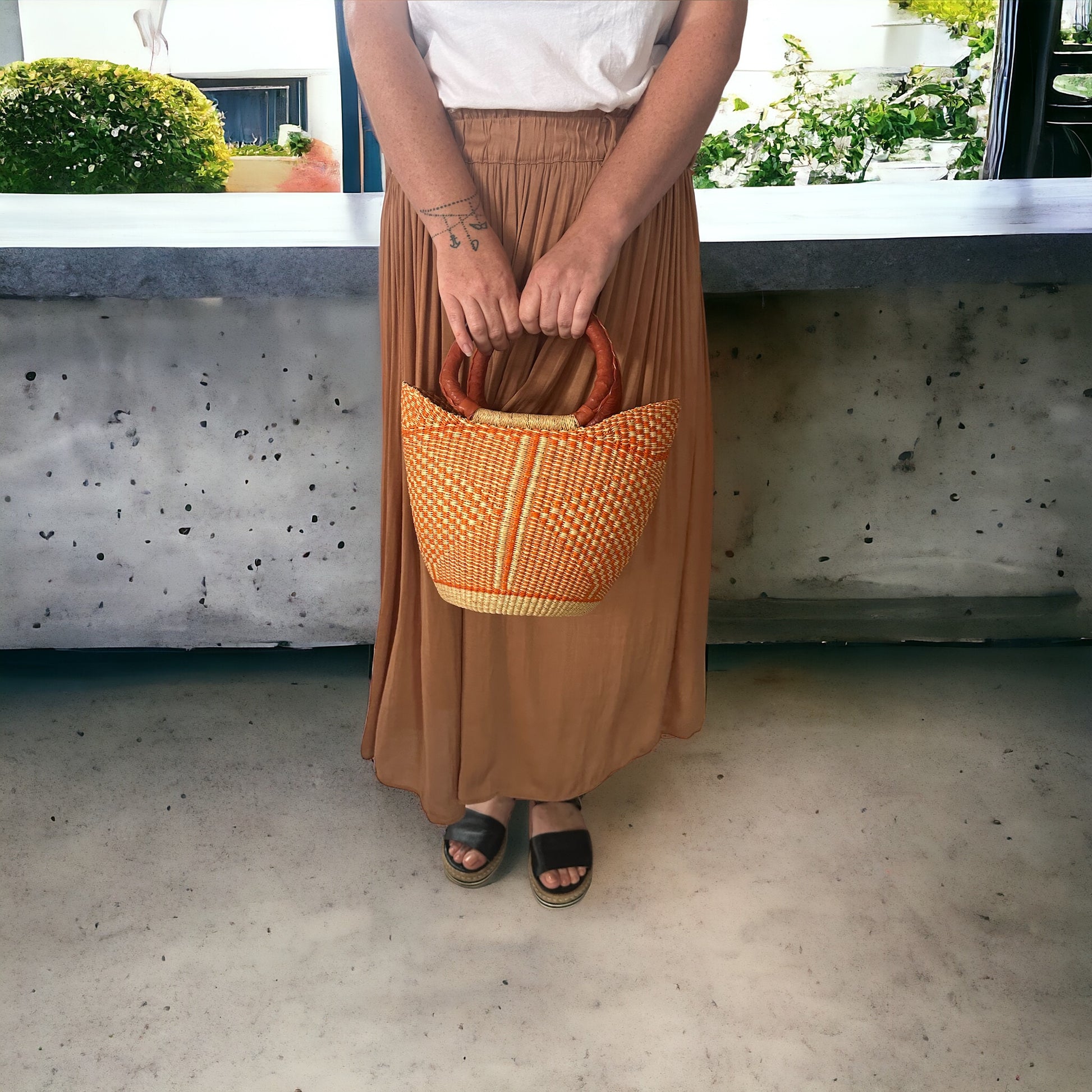 This basket is a bold statement in sustainability.Not only ethically sourced and environmentally friendly, it is a statement piece. Perfect for a lunch date enough room for the purse, phone and water bottle