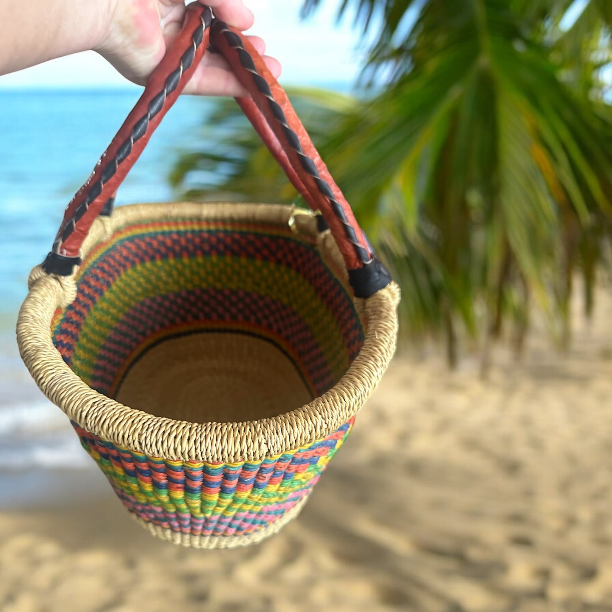 This basket is a bold statement in sustainability.Not only ethically sourced and environmentally friendly, it is a statement piece. Perfect size for wallet, phone and water bottle ‘Coastal Breeze’ Basket.