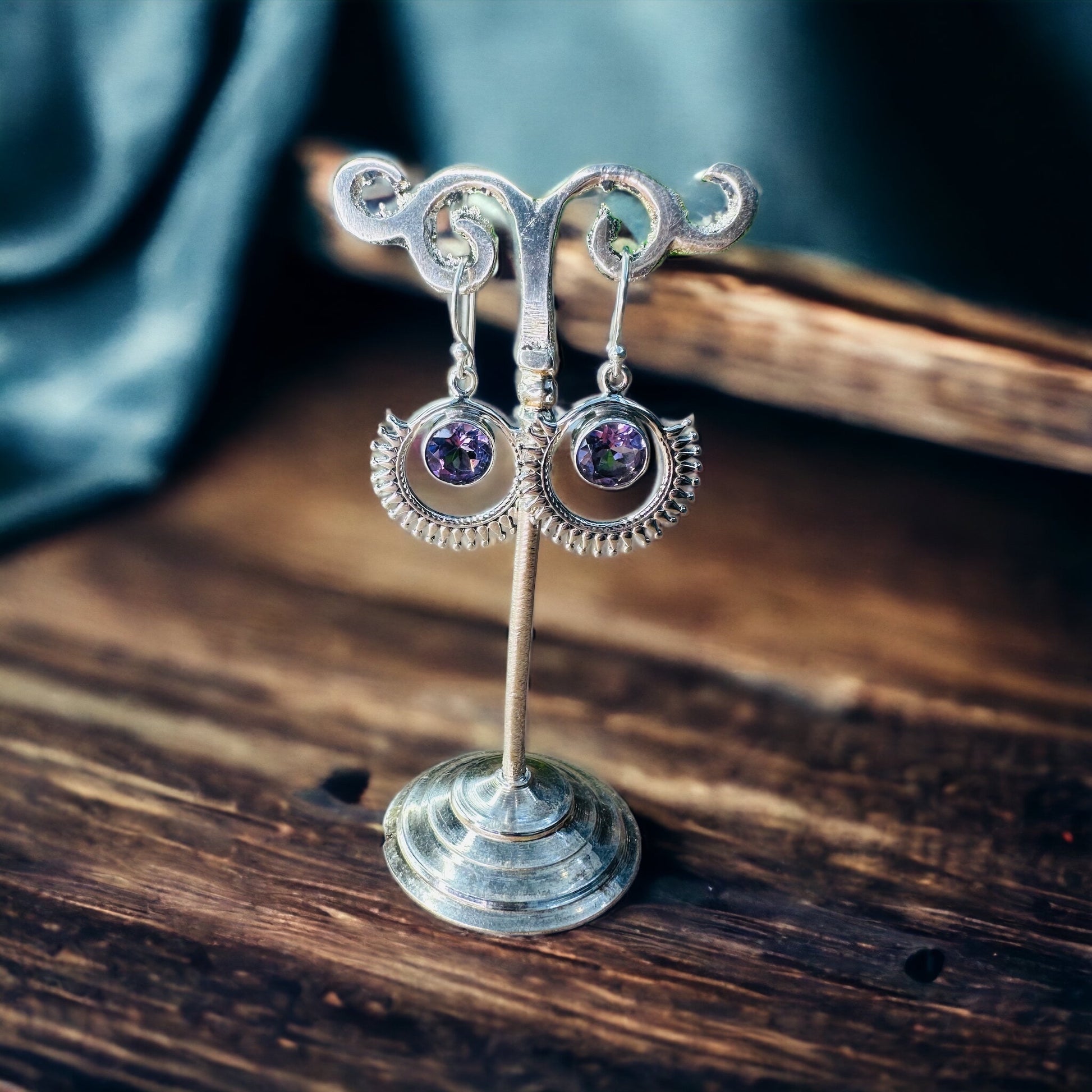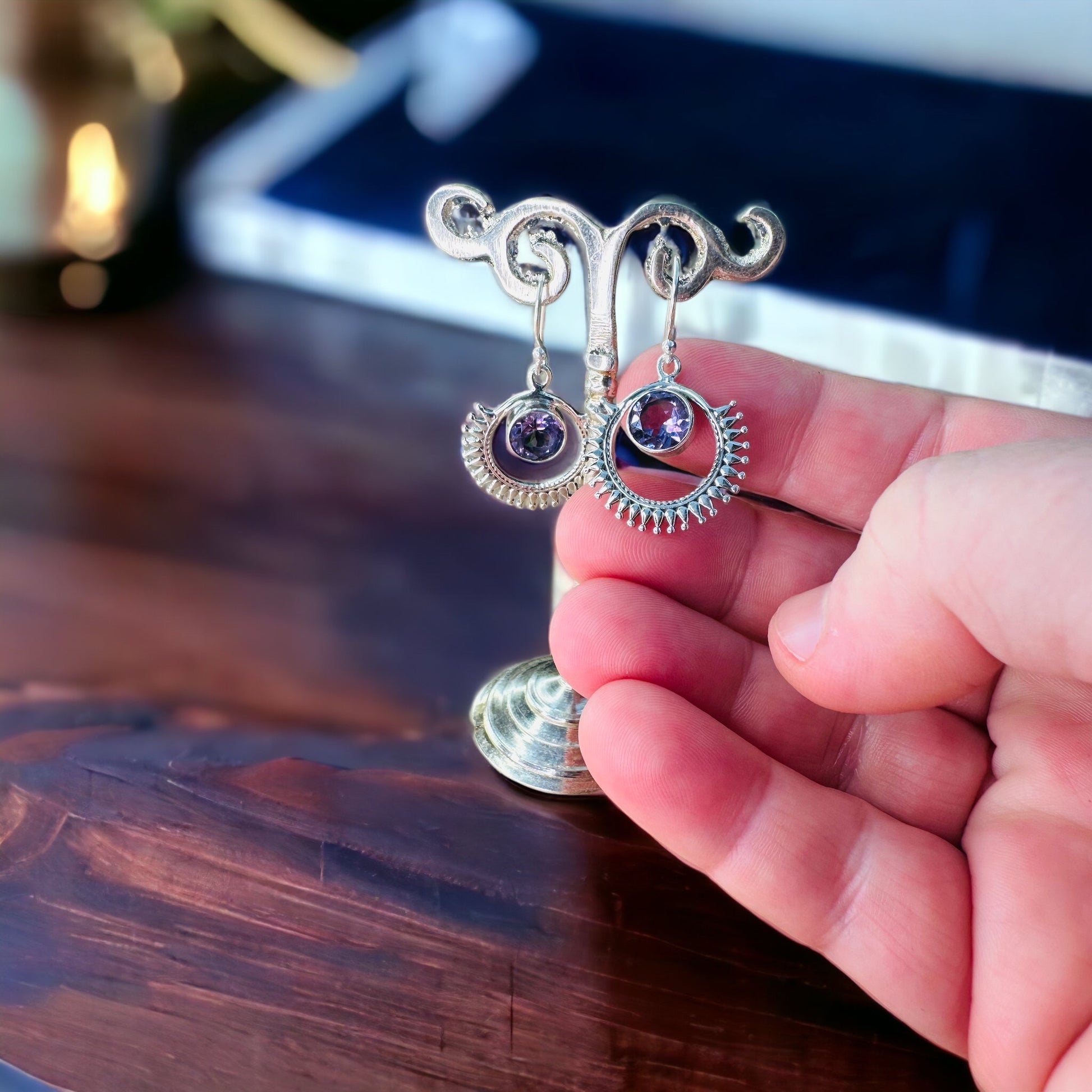 At the heart of each earring rests a captivating amethyst gemstone. The amethysts possess a rich, regal hue that ranges from a deep velvety purple to a lighter lavender shade. Their facets catch and reflect the light, creating a mesmerizing play of color that dances with each movement.