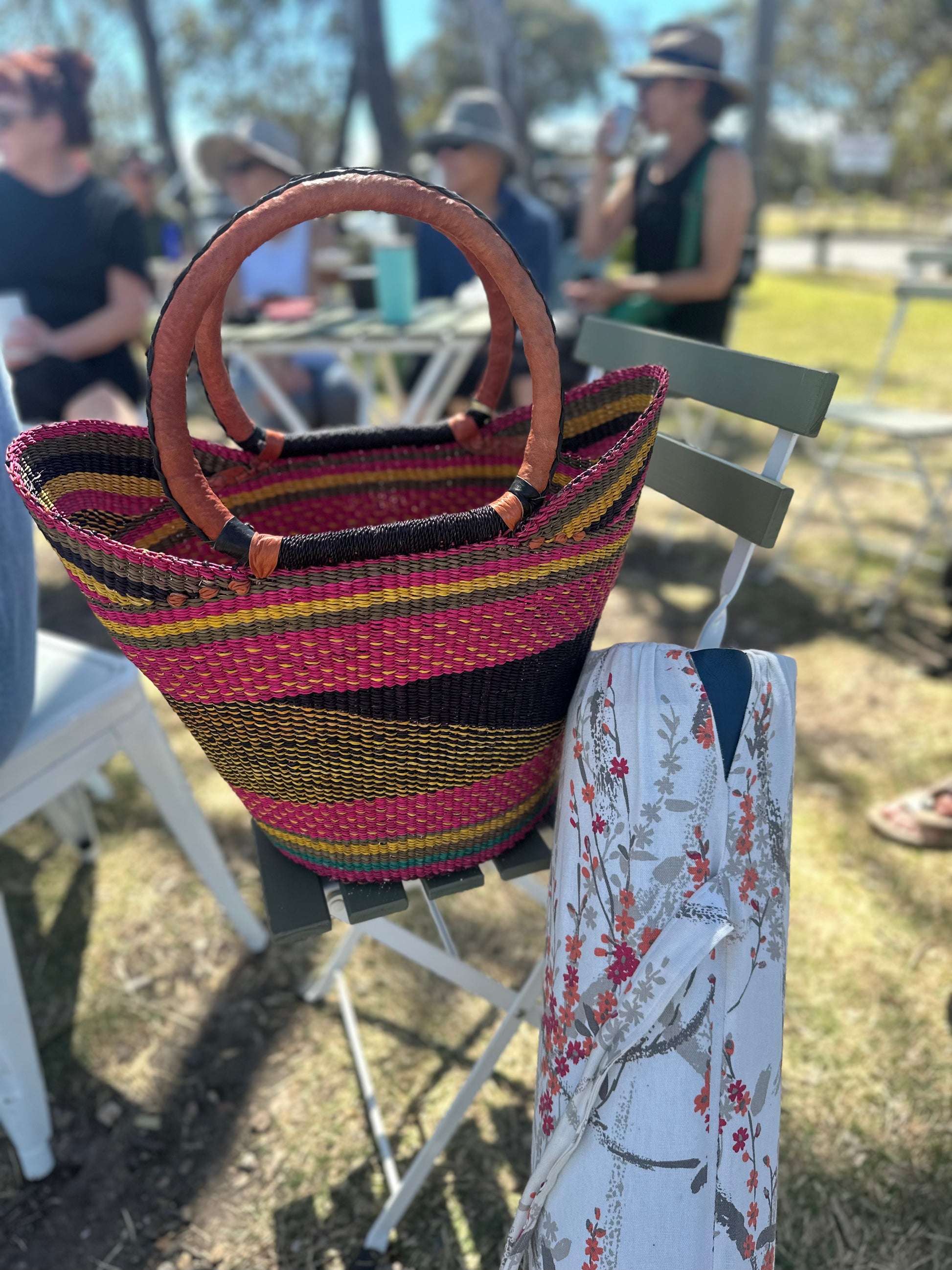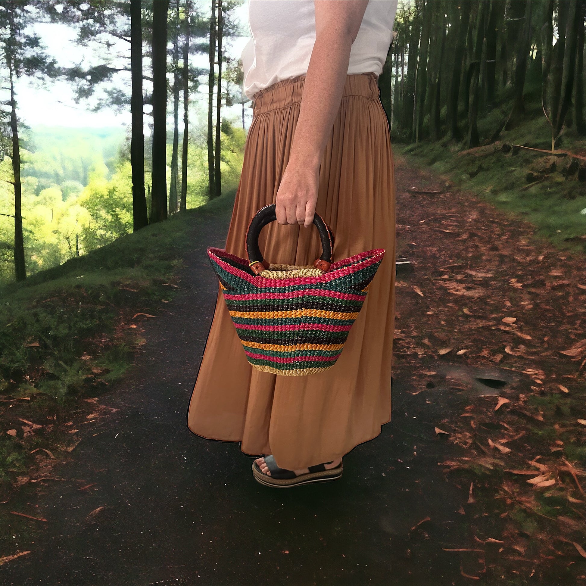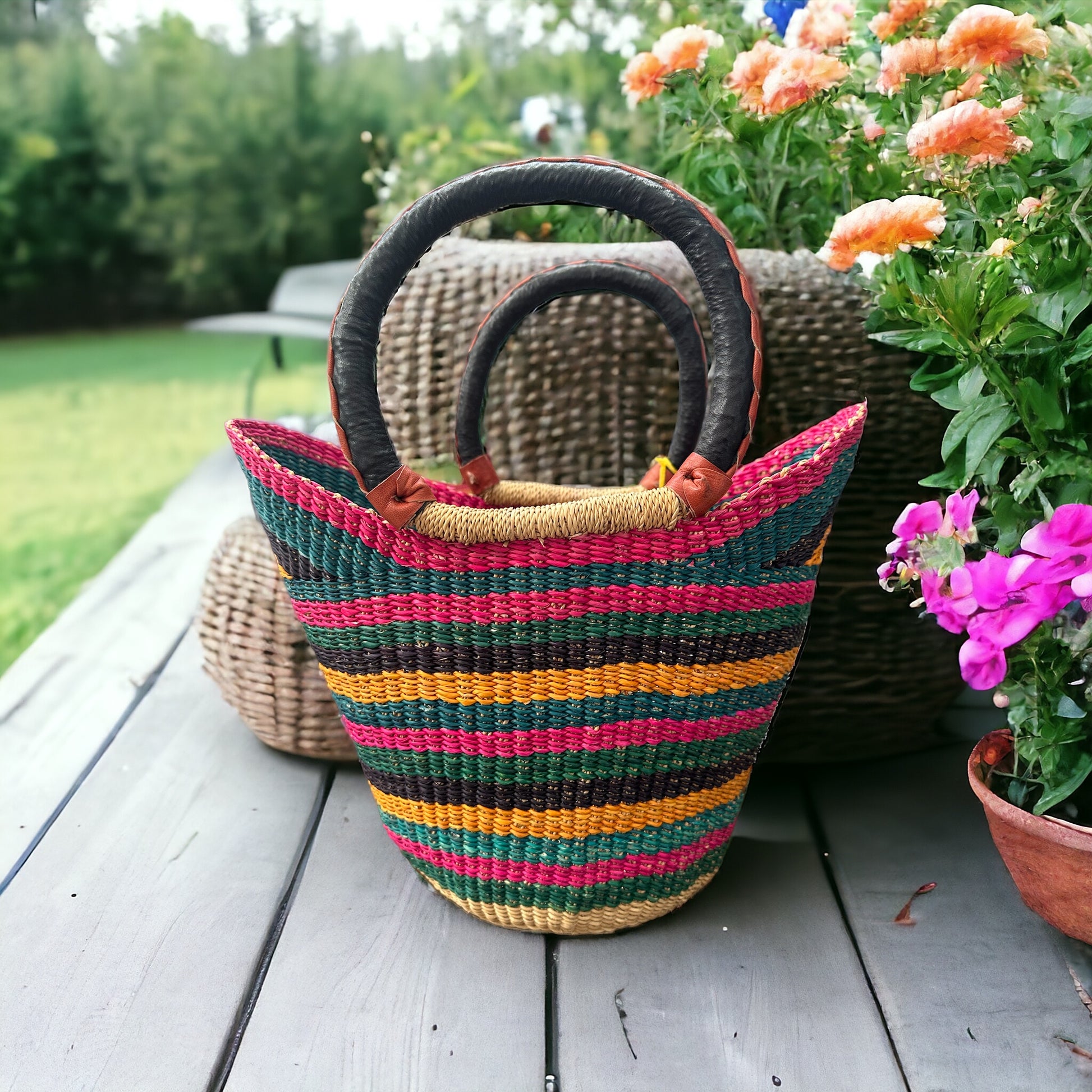 This basket is a bold statement in sustainability.Not only ethically sourced and environmentally friendly, it is a statement piece. Gone is the humiliation of dragging your green crumpled bag to grocer. You’ll be excited for grocery runs when you check out with your ‘Serengeti Sunset ‘Basket